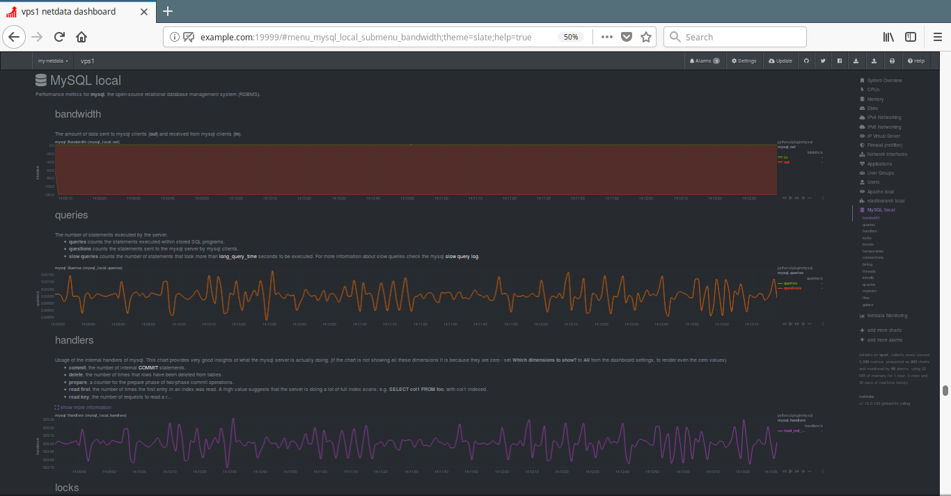 From the netdata dashboard, search for “MySQL local” on the right hand side list of plugins, and click on it to start monitoring your MySQL/MariaDB server. You will be able to watch visualizations of bandwidth, queries, handlers, locks, as well as galera, as shown in the following screenshot.